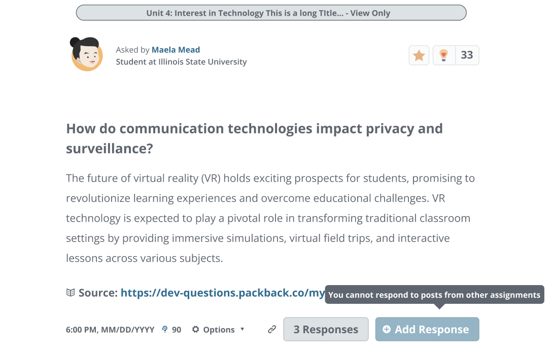 - View-Only Posts: Some posts will be marked as “view-only.” These are posts from previous assignments or those that are closed for responses. View-only posts will always include an explanation as to why they cannot be responded to, helping you understand the boundaries of engagement.