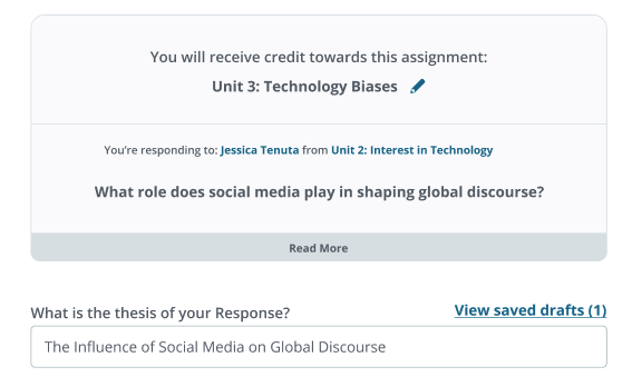 Multiple Open Assignments: If there are multiple open assignments, you can decide which assignment your post will count towards. A panel will appear when you start a new response, allowing you to select the desired assignment.